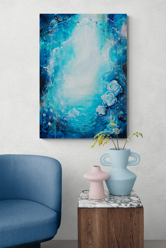 Tender Waters - Original Blue Abstract Rose Painting by Emily Louise Heard